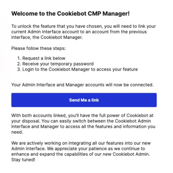 Let op dat het wachtwoord voor de CMP Manager anders kan zijn dan de admin interface van Cookiebot.